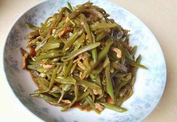 做法:四季豆切絲後焯水備用;豬肉切絲,用薑、蔥、料酒、生抽、淀粉、食用油,拌勻醃制,入鍋炒至變色裝出,四季豆入鍋翻炒,加入少量生抽、精鹽、清水,煮至熟透,加入肉絲,精鹽調味即可出鍋。