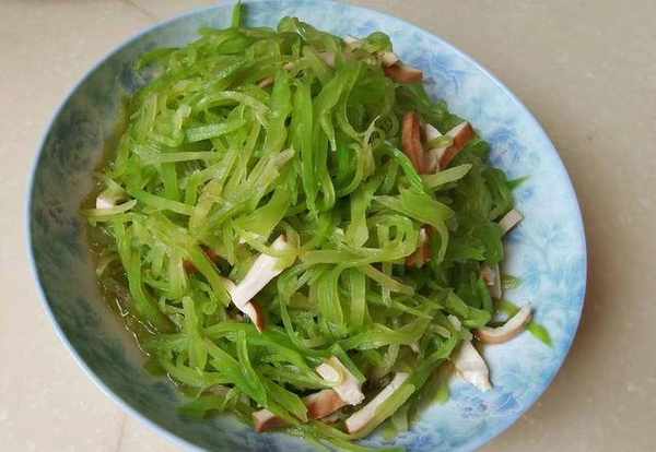 做法:萵筍去皮切絲,萵筍與蒜片同時入鍋,翻炒幾下,加點水煮軟之後,加入豆幹、精鹽、生抽,翻炒幾下即可。