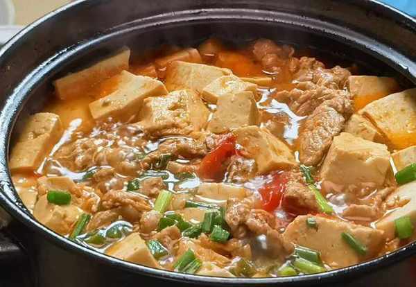 做法:砂鍋中加入番茄塊,炒一炒之後,加入豆腐,再放上醃制好的瘦肉,加入生抽、老抽、精鹽,適量番茄醬,加入清水,加蓋燉三、五分鐘即可,最後撒上一些蔥花。