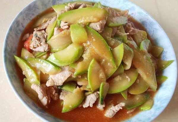 做法:西葫蘆切片焯水撈出,將豬肉末炒至變色,加入番茄炒一炒,加入西葫蘆,精鹽,醬油和適量清水,稍微煮幾秒鐘可出鍋。