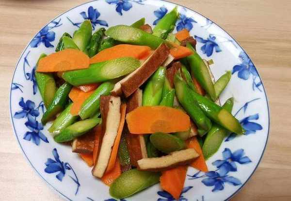 蘆筍炒豆幹:將蘆筍切片,與豆腐幹、胡蘿卜焯水撈出,鍋中加入蒜片、蔥段炒香,加入食材、精鹽,少量生抽醬油,翻炒幾下即可。