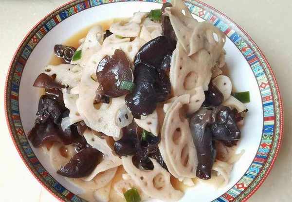 黑木耳炒蓮藕:黑木耳泡發備用,與蓮藕片入鍋焯水撈出;鍋中加入蒜片、蔥段炒一下,加入食材、生抽炒勻,加點清水燜一燜,加鹽調出鍋