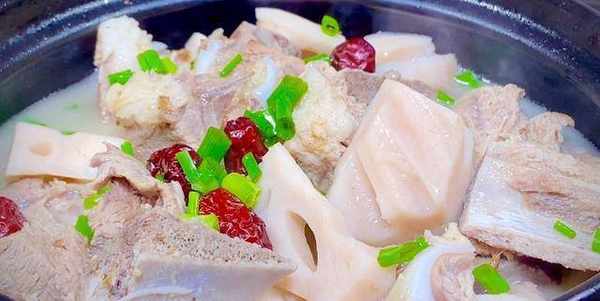 2、倒入砂鍋內,加蔥,薑片,清水,開大火燒開,再轉小火燉半小時。然後加入蓮藕,紅棗煮20分鐘,下入適量的鹽,蔥花。蓮藕排骨湯就做好瞭。