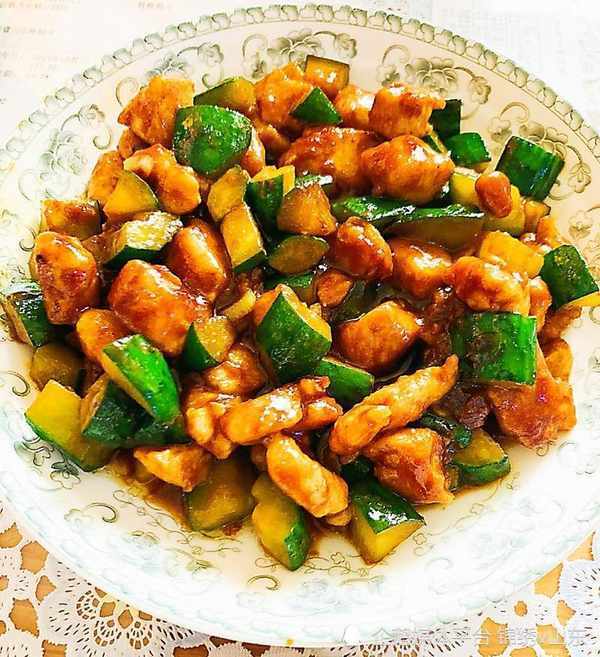 4、起鍋燒油,等到油8成熱時將雞肉滑入,使用大火翻炒,直到雞腿肉變色。再加入調好的調料繼續翻炒,可加入少量清水進行燜制,等到雞肉完全入味之後加入黃瓜丁,翻炒30s左右即可出鍋。