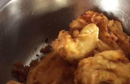 然後再放進油鍋裡炸,因為放有雞蛋,所以炸出來就比較酥,外焦裡脆,吃起來也特別的香……炸好之後撈出來,放在瞭油鍋上面的不銹鋼網裡,淋幹油。