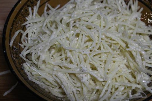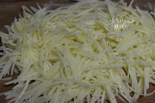 2,用擦絲器把土豆擦成絲,也可以切,不過做餅的話還是擦絲來的快,口感也比切的好。