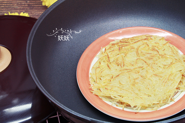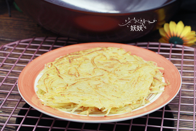7,一面煎黃後轉過來,把另一面也煎黃,整個過程非常快,土豆擦成細絲後很容易熟。