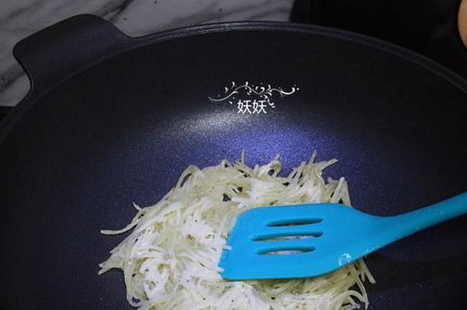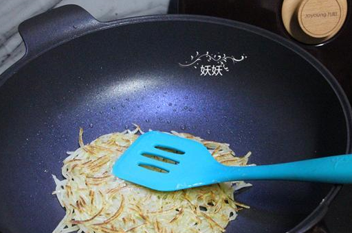 6,鍋中加少許的油,燒至六成熱,夾一筷子土豆絲擺入鍋中,整形成均勻的圓形,盡量厚薄一致。