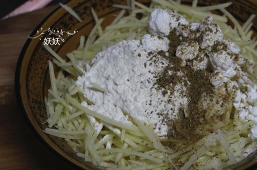 土豆兩個,胡椒粉少許,十三香少許,鹽一勺,生粉一勺。