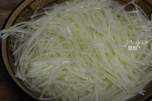 3,切好的土豆絲沖去淀粉,用清水浸泡十分鐘。