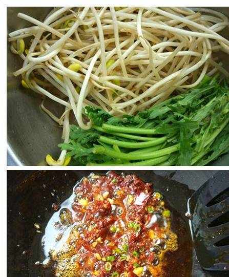 3.豆芽洗凈,焯水或者不焯水都可以,黃豆芽的話最好焯一下,比較好熟,也能去除豆腥味。茼蒿洗凈備用。如果加其他青菜也可以,洗凈備好。
