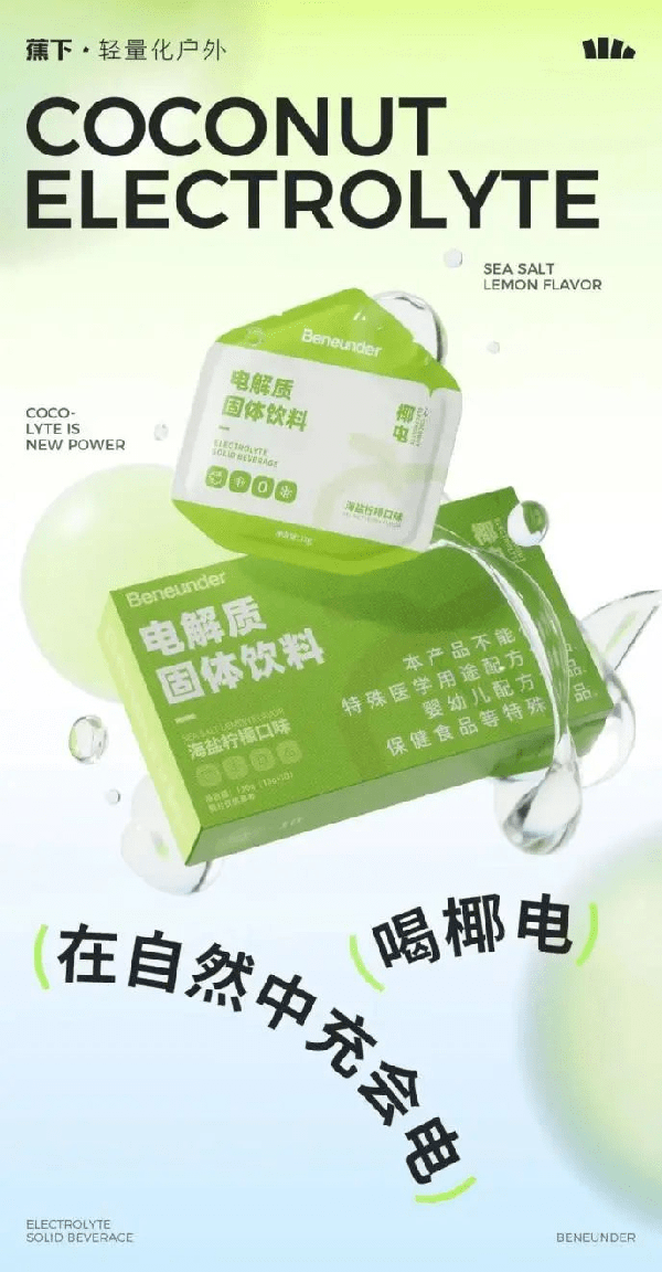 當下炙手可熱的國內防曬品牌「蕉下」也在2023年4月推出瞭一款功能性食品——椰電電解質粉,椰子這一元素真的是香餑餑。
