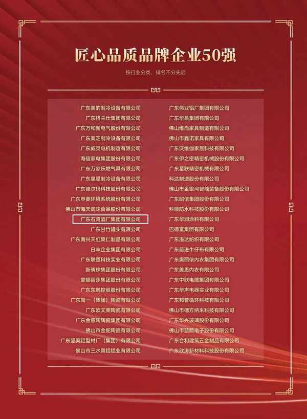 本次,石灣酒廠集團入圍匠心品質品牌企業50強,體現瞭其在佛山產業發展中的重要地位。接下來,石灣酒廠集團將繼續發揮企業引領作用,與佛山各大企業共同努力,擦亮“有傢就有佛山造”品牌,助力佛山制造業高質量發展。