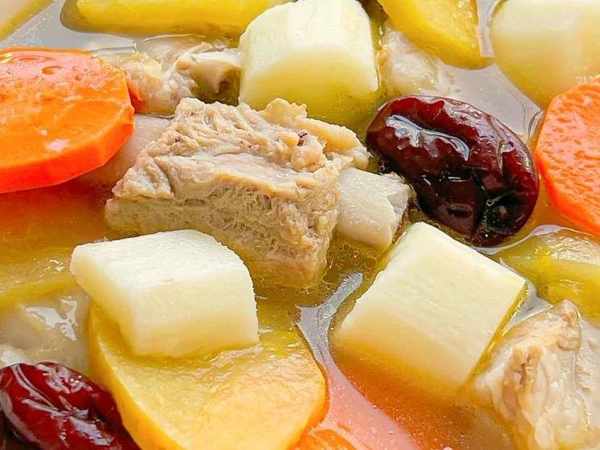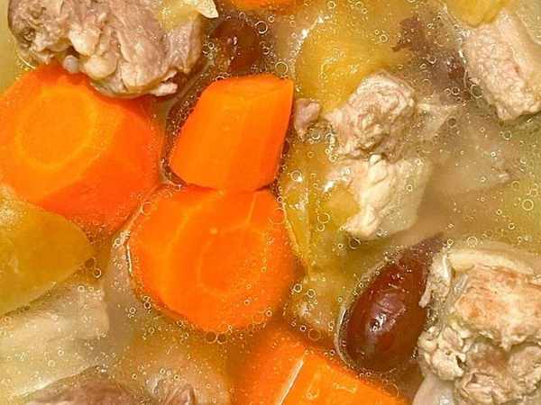3、將排骨、山藥、胡蘿卜、薑片放入湯鍋中,加入足量的清水,煮開後繼續煮20分鐘。接著放入蘋果和紅棗繼續煮20分鐘。