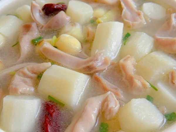 1、豬肚加入白醋和面粉抓洗一會兒,再清洗幹凈,剪掉油脂,然後冷水下鍋焯水,加入薑片和料酒去腥,煮開後撇掉浮沫,再撈起豬肚清洗幹凈切成條。山藥削掉外皮,清洗幹凈切成小段。