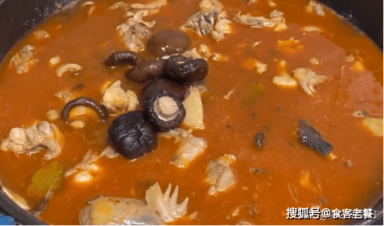 然後放入豆瓣醬、海鮮醬、老抽、一瓶啤酒,再倒入少許清水和香菇。水開之後,蓋上鍋蓋,先燉十分鐘