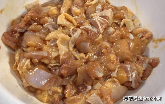 首先在剁好的雞肉塊中,加入一勺食鹽,少許料酒,一勺面粉,抓拌至表皮有點粘稠的狀態