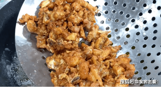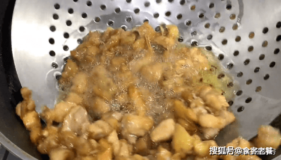 鍋內油溫再次升高,把雞肉塊倒入鍋中復炸一下,一分鐘左右,把雞塊炸到顏色變得金黃酥脆控油撈出。