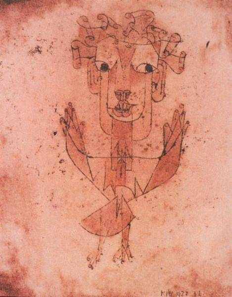更有趣的是,線性的、進步的歷史序列,在本雅明眼中隻是廢墟的不斷積累,這種廢墟式的表達同樣出現在劇裡和現實中。他選擇瞭保羅·克利的《新天使》畫作描述這一觀念,即歷史天使“朝著過去,在我們認為是一連串事件的地方,他看到的是一場單一的災難。這場災難堆積著屍骸,將它們拋棄在他的面前”。天使想停下修補世界,但天堂吹來的風猛烈吹擊翅膀,使得天使無法行動,面前的廢墟愈加壘高。本雅明將這股風稱為“進步”。