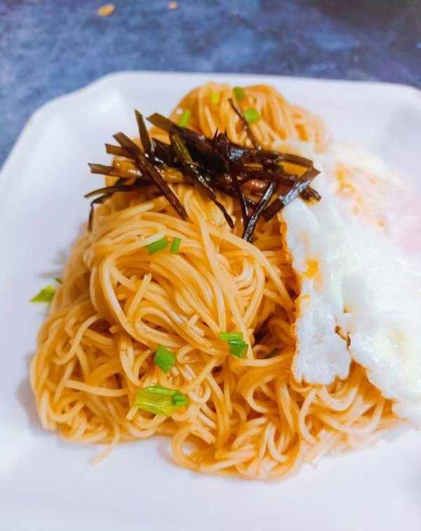 7.將蔥油淋到面條上,攪拌均勻,在加上煎蛋,就完成瞭!