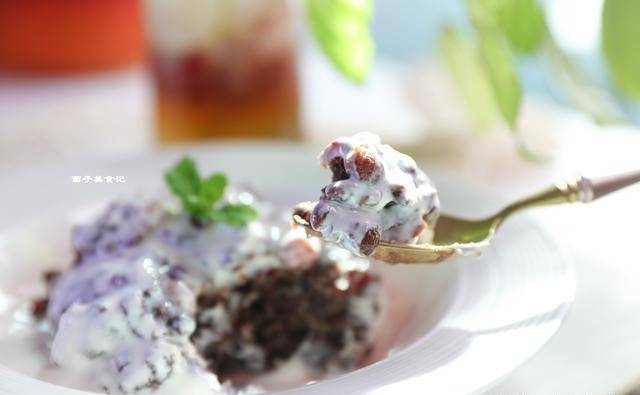 第五步:將煮好的紅豆放涼後裝盤,倒入從冰箱裡拿出來的酸奶。