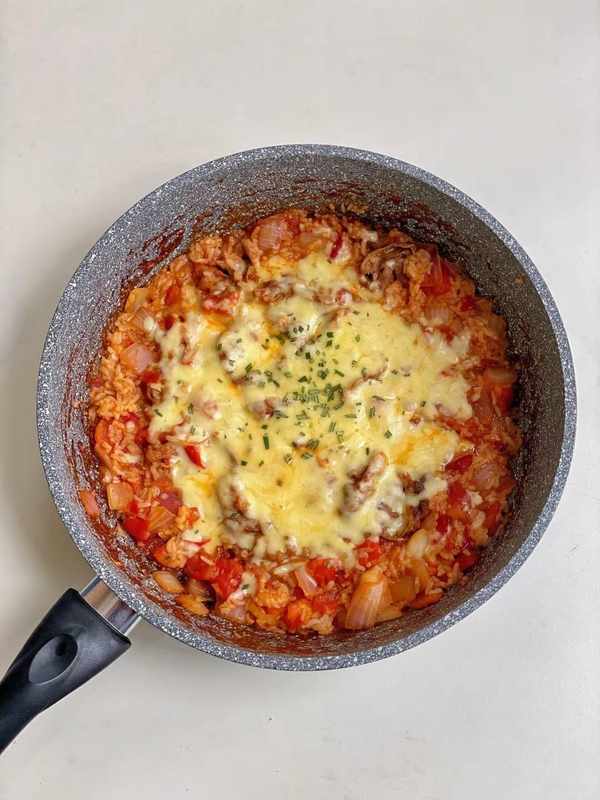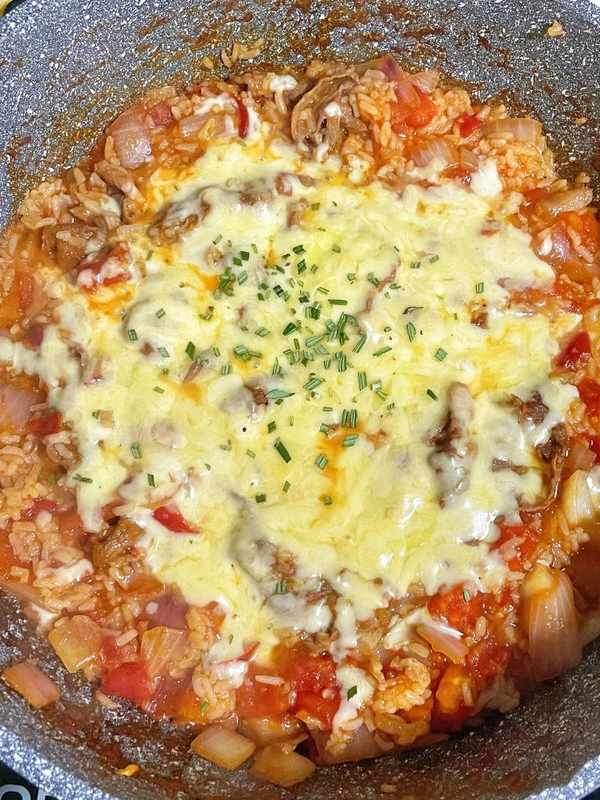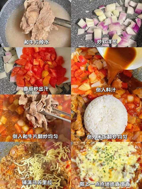 建議提前將番茄在冰箱裡凍一下,會更好剝皮,更加出汁哦~步驟:1、牛肉卷焯水撈出。2、另起一鍋放入洋蔥炒軟,加入切好的番茄丁。3、倒入調料汁,加入焯好的牛肉卷翻炒均勻後,加入米飯炒均勻。4、表面撒上一層芝士碎,蓋上鍋蓋燜至芝士碎化開撒上一點迷迭香或歐芹碎就做好啦!