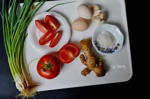 取拇指大小的薑塊剁蓉,蒜瓣切片,蕃茄切小塊備用。