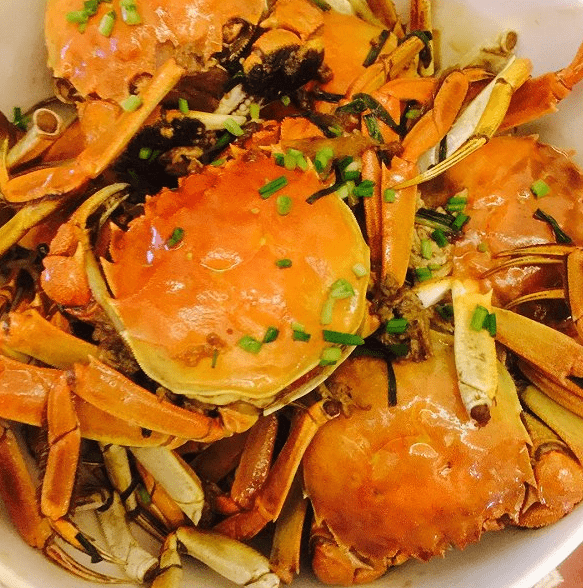 第四道是蒸螃蟹,第五道是燉帶魚,第六道是醬香豬蹄,第七道是燉羊肉,第八道是辣雞,第九道是涼牛肉。光是這些菜就有足夠的分量,把餐桌擠得緊緊的,都擺不下瞭。
