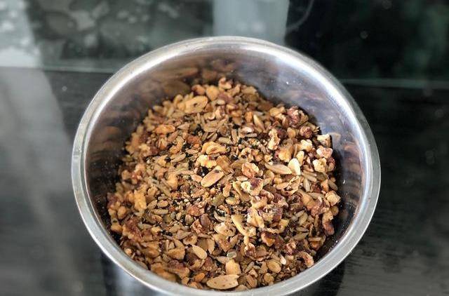6.烤熟的果幹稍微用搟面杖搟壓碎一些,加入熟黑白芝麻,放在一起攪勻(因為我用的芝麻是熟的,所以就不用再烤瞭)