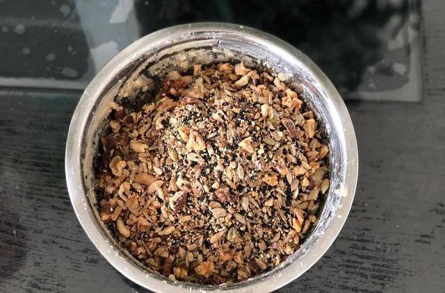 10.最後加入之前做好的堅果碎,充分拌勻,加入少量涼白開調解餡料的軟硬度,可以成團並且用手指能輕松戳動的狀態即可
