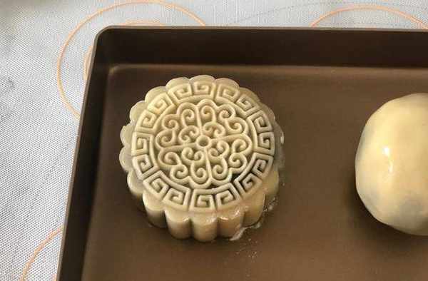 14.取一份面團在掌心按扁,包入一枚餡料,小心包好,用月餅模具按壓出月餅的形狀,一個月餅坯就制作完成瞭,將所有月餅壓出喜歡的花紋