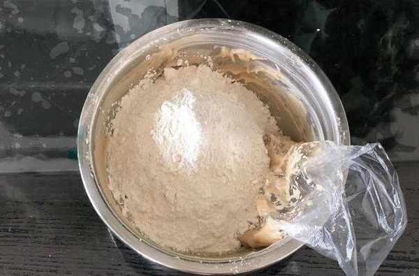 9.加入烤熟的面粉和糯米粉,小心抓拌均勻
