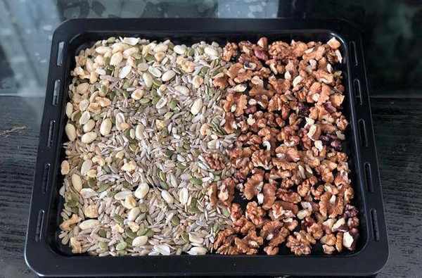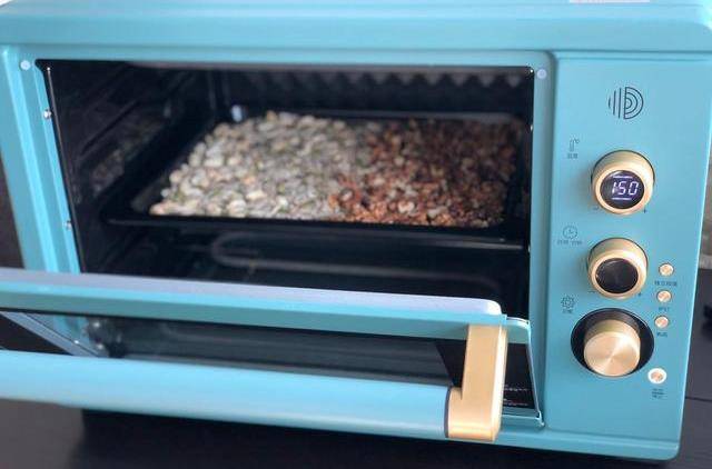 3.烤箱中層預熱150度,上下火,烤20分鐘左右,幹果表面微微變黃就是烤熟瞭,取出稍微晾涼