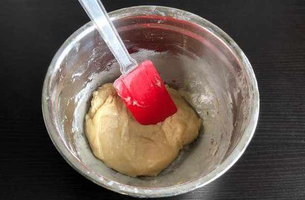 12.接著來制作月餅皮,在轉化糖漿中加入梘水充分攪拌均勻後分3次加入玉米油,充分拌勻乳化,加入高筋面粉和低筋面粉用刮刀拌勻至無幹粉,表面覆蓋保鮮膜靜置松弛半小時