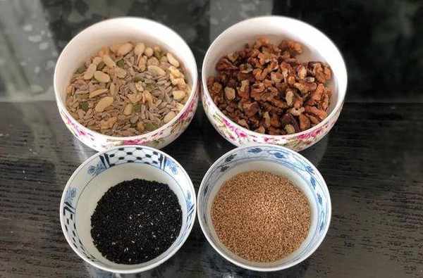 1.先來看看我的五仁餡料用到的幹果,南瓜籽仁,葵花籽仁,花生仁,核桃仁,黑芝麻,白芝麻,非常簡單而且廉價,即便是這樣做出來的味道也很棒