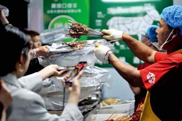 4月30日,淄博市張店區一傢“網紅”燒烤店,服務員給顧客上烤串。圖/新華