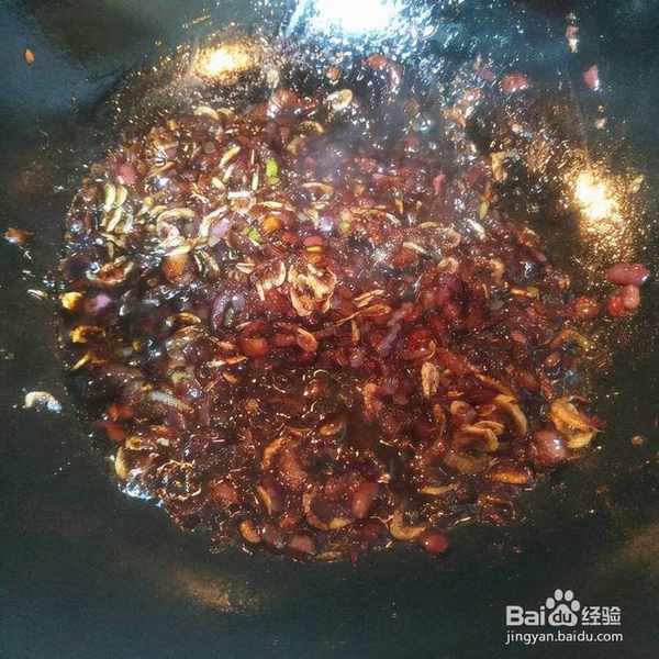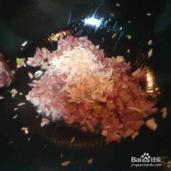 5剩餘的基礎油先用洋蔥放大切碎,有香味後放入洋蔥碎。洋蔥變色後,加入蝦皮,用慢火慢炒。