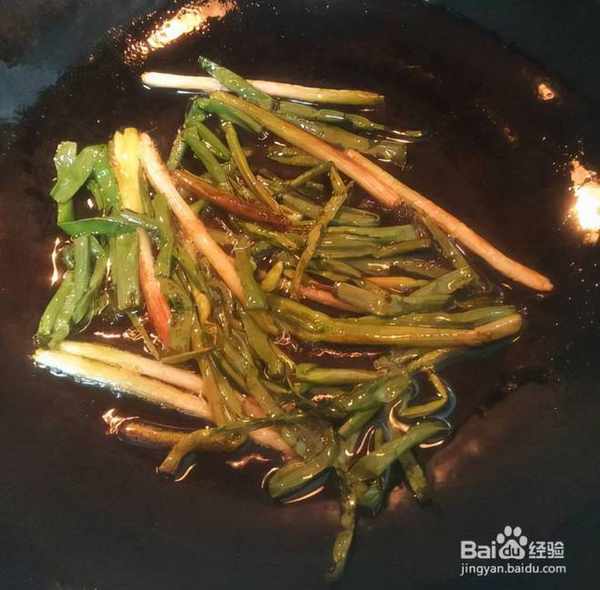 3鍋裡放的油比炒的多,放在蔥段,用小火慢慢炒。