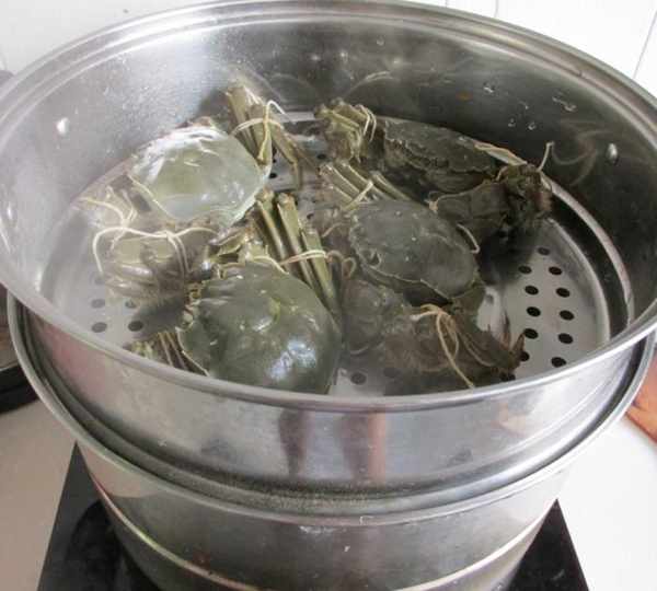 鍋裏燒開水,把螃蟹放到篦子中,準備蒸煮。