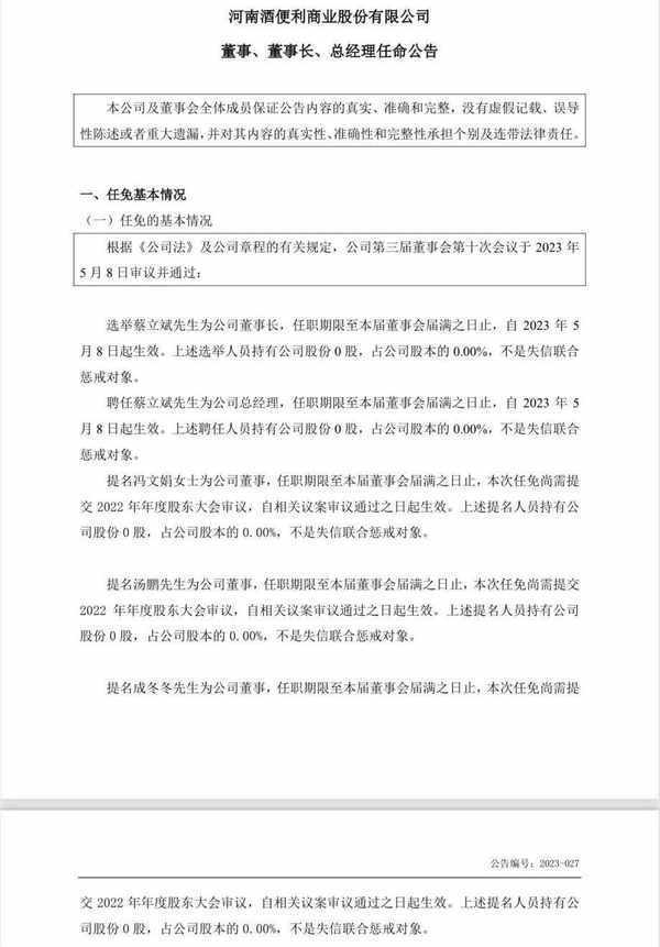 劉鵬辭職同日,酒便利發佈董事、董事長、總經理任命公告。公告顯示:選舉蔡立斌先生為公司董事長,任職期限至本屆董事會屆滿之日止,自2023 年5 月8 日起生效。同時聘任蔡立斌先生為公司總經理,任職期限至本屆董事會屆滿之日止,自2023年5月8日起生效。