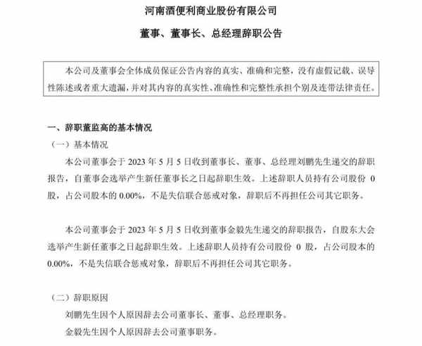 公告顯示,劉鵬和金毅皆是因個人原因辭去酒便利相關職務。