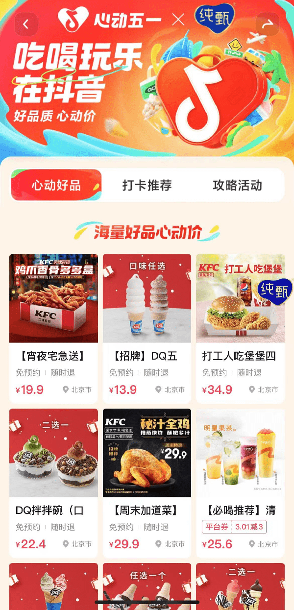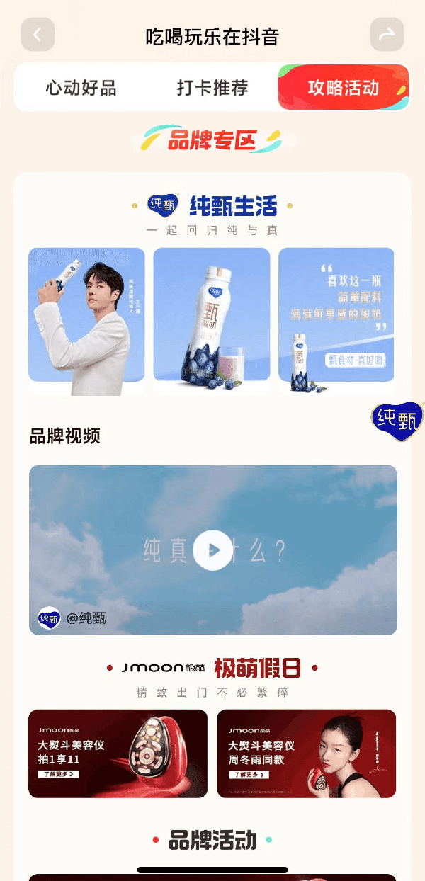 在「心動五一」線上會場內,純甄獨傢冠名權益得到瞭充分展示,主話題、主活動、三大分會場頁面全方位的露出,讓品牌沉浸式出現在用戶線上吃喝玩樂場景的選購頁面。品牌專區內品牌TVC等視覺化的表現形式,塑造年輕、純真的場景氛圍,拉進與年輕人的情感距離,有效傳遞“回歸純與真”的品牌理念。抖音生活服務還基於平臺豐富的流量基礎,通過為純甄提供抖音開屏、專屬阿拉丁、搜索詞展示、同城美食頻道tab展示等優質站內資源,助推純甄品牌在五一節點持續吸引用戶目光。熱門活動節點下的高頻曝光、活動豐富的站內助推資源,全方面滲透著五一假期對吃喝玩樂有需求有興趣的核心目標群體,同時直接連結線下消費場景與純甄甄酸奶,對用戶進行無形種草和興趣滲透。