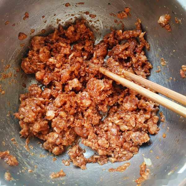第五步:放到調好味道的肉餡中,攪拌均勻,餡料就做好了。