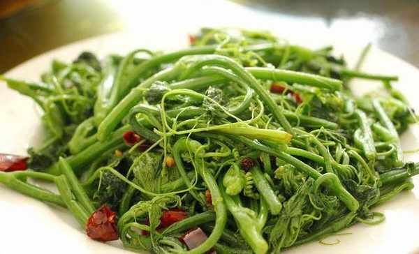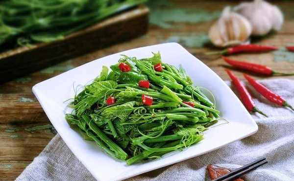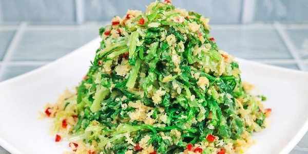 1、南瓜尖的外皮撕掉,清洗幹凈。鍋中把水燒開,放入一勺食鹽和食用油,然後把南瓜尖放進去焯水。焯熟以後撈出來過涼水。