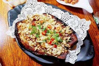 蒜泥茄子(總熱量約為105千卡,蛋白質4.1克,脂肪3.7克,糖類18.2克。)