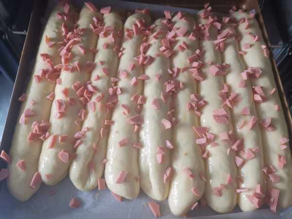 第四步:烤盤鋪上油紙,把搓好的麵包坯子均勻的放到烤盤中,蓋上保鮮膜靜置發酵成2倍大。