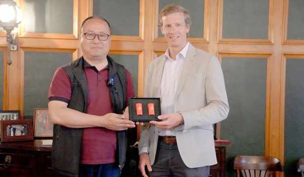 圖 酣客老王向比利時佈魯塞爾烈酒協會負責人贈送伴手禮