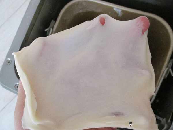 1,所有資料放入麵包桶內,揉成團後,加入黃油,揉出手套膜。