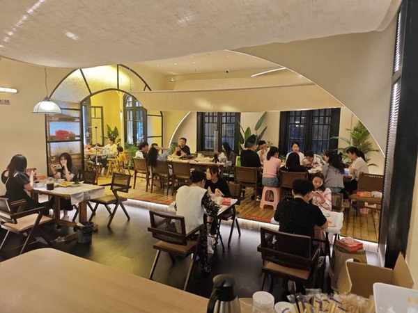 比如肥肥蝦莊黃鶴樓聯名店,該店原是一棟百年老洋房,擁有石磚外墻、挑高吊頂、鐵藝窗欞等歐式建築特征,在保護這棟建築原樣的基礎上,肥肥蝦莊請90後設計師操刀設計,將時下年輕人喜愛的露營風融入其中,打造一種中西結合、宜古宜今、輕松自在的門店風格。