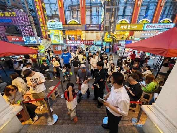 4月30日,杭州遊客李先生慕名來到武漢江漢路步行街的肥肥蝦莊黃鶴樓聯名店,盡管來之前已經做好攻略,瞭解到該門店經常需要排隊等位,但到瞭現場,還是被門店的客流驚到瞭。